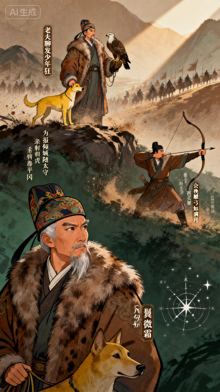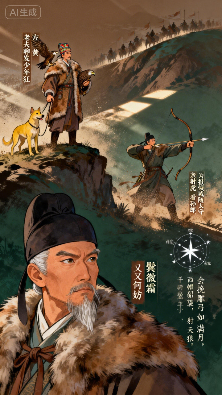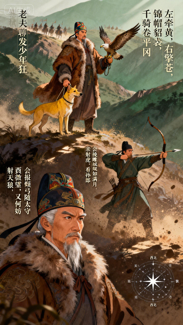 结句“会挽雕弓如满月,西北望,射天狼”,将豪情推向顶峰。拉满的雕弓如圆月,目光直指西北外敌,杀敌报国的壮志与狂气直冲云霄。 全词以出猎起兴,抒报国之志,狂而不躁,豪而有骨,是豪放词的标杆之作。