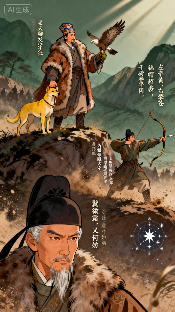 “左牵黄,右擎苍,锦帽貂裘,千骑卷平冈”,寥寥数笔勾勒出太守出猎的壮阔场面:牵猎犬、擎苍鹰,随从千骑席卷山冈,气势震天。 “为报倾城随太守,亲射虎,看孙郎”,他以孙权射虎的典故自比,尽显英雄豪情。酒酣之后,更抒壮志:“鬓微霜,又何妨”,岁月染鬓又如何?一腔报国热忱丝毫不减。他借冯唐持节的典故,盼朝廷重用,渴望奔赴疆场。