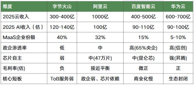 字节抢份额、百度抢政企、华为抢基建——阿里三线作战。 字节的中枢风险:ToB办事能力弱。豆包Token量大,但企业客户ARPU远低于阿里。字节擅长的是C端流量,不是B端办事。若是企业客户条目定制化处罚决策、专属模子、土产货化部署,字节的短板就会显现。 百度的中枢风险:买卖化慢。文心一言在政企商场中标多,但技俩制录用周期长、毛利低。百度智能云的AI收入占比虽高,但MaaS的圭臬化程度远低于阿里。 华为的中枢风险:生态阻塞。昇腾芯片+MindSpore框架是全栈自研,但开发者生态远不如阿里云。华为云在信创商场有政策红利,但在买卖云商场,阿里云仍是首选。 阿里最大的舛错不是工夫,是政企商场的浸透率和芯片国产化的程度。 六、底线:三种状态,三种估值