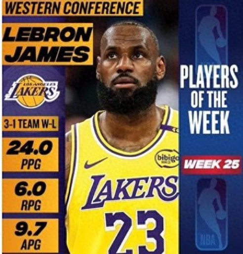 2025-2026赛季NBA通例赛落下帷幕,湖东说念主队最终获取西部第四,在北京时辰4月14日,NBA官方公布了2025-26赛季通例赛第25周(临了一周)的周最好球员,湖东说念主球星勒布朗.詹姆斯毫无悬念确当选西部周最好,这亦然其职业生存第70次当选周最好,再次刷新了NBA历史记载。