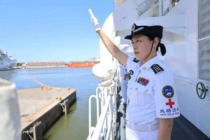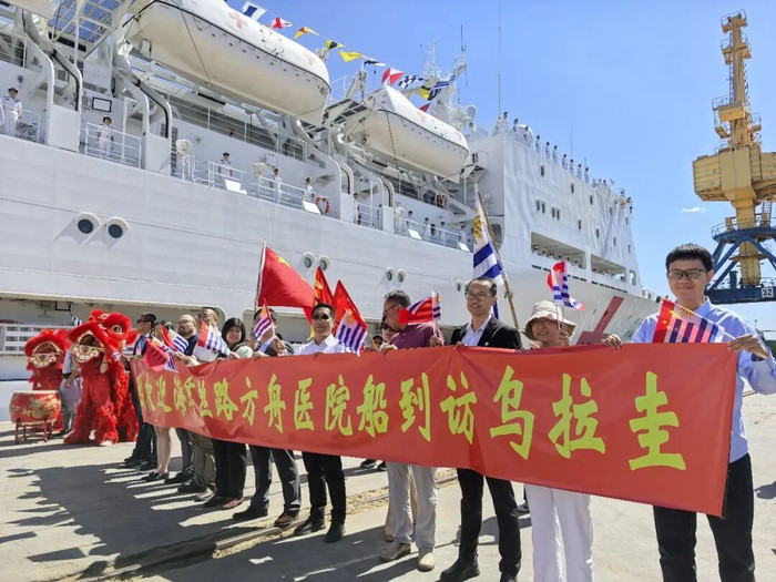 上午10时许,“丝路方舟”号医院船悬挂中乌两国国旗,缓缓驶入蒙得维的亚港。乌拉圭国防部、海军相关军政要员,中国驻乌拉圭使馆工作人员、中资机构代表、华人华侨代表等齐聚码头,挥舞中乌两国国旗致意,共同迎接这艘满载友谊的“生命之舟”。