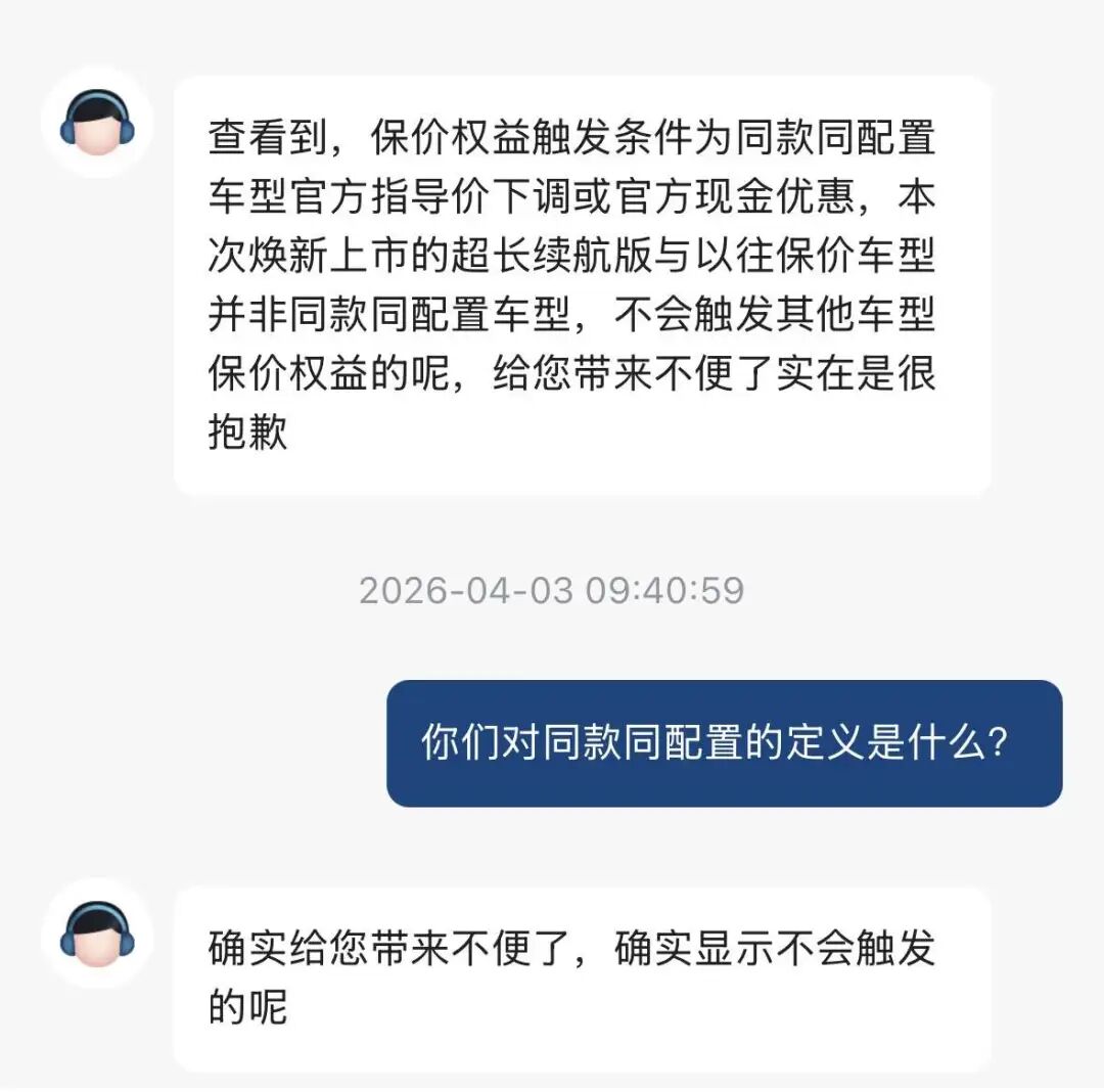 (本文作家为 电厂,钛媒体经授权发布) 文 | 电厂,作家 | 翟芳雪,裁剪 | 高宇雷 一个有300余名深蓝车主的维权微信群也曾运营了半年多,他们皆是因为“保价公约”与深蓝汽车产生纠纷,“silience”是其中一员。 本年3月,网友“silience”在小红书发帖称,其在2025年5月购入深蓝S09后驱Ultra+版块时,销售东说念主员曾出示一份“保价公约”。公约答应,在长达一年的保价期内,“若同款车型带领价下调或出现现款促销,将抵偿差价”。 然则,仅过三个月,深蓝汽车推出了电板容量与充电功率均有所升级的新款S09,增多了四驱Ultra+超长续航高定版以及后驱ultra+超长续航版,官方带领价与三个月前首批上市的深蓝S09四驱Ultra+高定版以及后驱ultra+版块一致,折柳为30.99万元起以及27.99万元起。在官方带领价交流的基础上,新款深蓝S09提高了续航里程并增多了5C超充功能。 当车主依据公约向销售东说念主员要求抵偿时,却遭拒却。该网友称,销售东说念主员以“电板容量不同,属于新车型”为由,认定其不适用于原有保价答应。此举被车主质问为刻意窄化“同款车型”的界说,愚弄神气条目片面侧目牵扯。在新款上市的同月,老款车型自满“停售”下架,导致二手车价值暴跌。 电厂就此情况向深蓝汽车的官方客服进行规划,得到了访佛的回答,客服称:“本次焕新上市的超长续航版与以往保价车型并非同款同建立车型,不会触发其他车型保价权利。” 图源:深蓝汽车小技艺截图 电厂从该车主处了解到,他方位的微信群名为“一群被背刺的深蓝S09车主”,群内已有300余东说念主,均为同款车型、访佛遭逢。最近,群中已有车主抒发出拿告状讼的意向。 据进一步了解,在客岁新款深蓝S09推出后就也曾出现了老车主大限制抗议的事件,仅仅深蓝官方一直莫得确切处理见解。发帖的网友暗示,自2025年9月于今,他屡次通过400客服热线、官方APP等渠说念反馈问题,均未获取本色性回答。 相同是本年3月,深蓝公布了亮眼的月销量战绩:巨匠销量破3万辆,环比增长87.8%,同比增长30%,刚好跨过深蓝董事长邓承浩此前提到的“盈亏均衡点”。与此同期,从客岁年底到本年3月,深蓝完成了61.22亿元融资,并引入新的策略股东。 深蓝的一系列行为皆表露着“顾头不顾尾”的霸道,而这是行业内好多车企濒临的共同处境。在强烈的淘汰赛中,即便也曾站上月销3万辆的新台阶,深蓝仍身处糊口之困。 饮鸩而死的保价公约在客岁5月推出保价答应时,深蓝成绩了消耗者颇多好评。在资格了多轮降价“背刺”之后,消耗者也曾民风了车价每每波动。此时,一家车企提倡“保价一年”的答应,显得颇为疏远。 不同于几年前车企集体推出“保价政策”的时代,米兰这一次,在深蓝之后跟进的品牌稀稀拉拉,何况保价期限等闲只须三个月傍边,远低于深蓝的一年。 行业的冷淡反应,某种过程上也曾透露问题:在现时的汽车市集环境下,保价并不是一手好棋。 图源:作家翟芳雪摄 一方面,汽车手艺迭代速率也曾着实干涉“日月牙异”的阶段。扶助驾驶系统捏续升级、芯片算力快速提高、超充功率束缚提高,新车型的更新频率远超以往。在这么的配景下,旧车型的居品力不能幸免地快速衰减,而保价答应却险些锁死了价钱休养空间,反而加快了车型竞争力的下滑。 易车车型库数据自满,2025年中国乘用车市集共上市新车1278款(车系),同比增长6%,平均每天就有3.5款新车型发布。过快的迭代速率以致迫使监管层动手。本年1月,工信部发布新规,要求传统燃油车在居品准入时必须完成不少于3万公里的可靠性行驶磨真金不怕火,新能源车则需完成不少于1.5万公里。 另一方面,保价公约往往并不会成为消耗者购车时的决定性成分,但一朝出现争议,却会速即演变为品牌风险。 车质网发布的投诉分析申诉自满,2025年,自主品牌投诉量再创历史新高,同比高涨53.4%,投诉占比初度迥殊总量的5成,较2024年提高8.3个百分点。从投诉类型来看,迥殊9成的投诉问题点围聚在“新旧款迭代纠纷”,开云已成为现阶段自主品牌投诉的核肉痛点。其中,就包括部分未本质保价公约的车企,遭到消耗者围聚投诉。 图源:车质网公众号 干涉2026年一季度后,从电厂的检索成果来看,在中国上市的新车险些也曾莫得再作念出保价答应的品牌。这也从侧面响应出,车企对异日价钱竞争的预期并不乐不雅。 降价,仍是车市的主旋律。 乘联会数据自满,2026年3月,新能源车促销幅度回升至10.6%,处于中高位水平;传统燃油车促销幅度达到22.7%,已联贯9个月看护在23%傍边。 利润率相同在捏续下探。2026年1—2月,汽车行业销售利润率进一步降至2.9%,处于历史低位,而2025年全年这一筹画也只须约4%。 在这么的环境中,深蓝也难以开脱以价换量的轮回,以致陷得更深。 深蓝S07、S09、SL03以及G318等多款热点车型,皆曾出现过公开或变相降价。围绕这一问题的投诉也日出不穷。随之而来的,是保值率的下滑。有深蓝S7车主暗示,深蓝换代降价太快,让收他车的二手车商赔了6000元。 从中国汽车通顺协会公布的3月中国汽车保值率申诉看,在各价钱段、各尺寸级别、各能源神气的汽车保值率榜单中,均未出现深蓝车型的身影。 在就义利润、保值率、以及与老车主的酌量后,深蓝果真换来了销量成果。本年3月,深蓝巨匠销量为31742辆,环比增长87.8%,同比增长30%。邓承浩曾明确强调,“在销量迥殊3万辆的情况下,深蓝