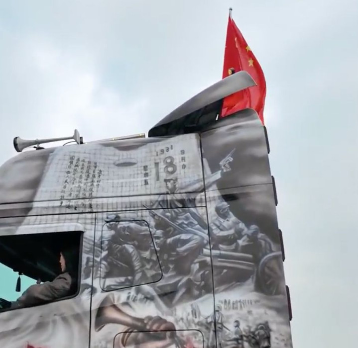 转到车身侧面,这一幅画面让人瞬间泪目。这是1937年12月13日的南京,南京大屠杀的惨痛记忆被刻画在车身上,赫然写着勿忘国耻四个大字。每一个笔触都在提醒卡车e族们,那段至暗时刻不能忘。 来到车的左边,对于卡车e族这个东北孩子来说,触动更深。这里画的是1931年的沈阳,九一八事变。看着这幅涂装,仿佛能听到当年的警报声,那段屈辱的历史刻骨铭心。