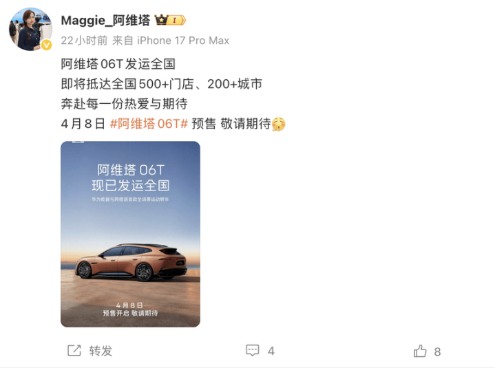易车讯日前,阿维塔整相助销副总监发文暗意,阿维塔06T将于4月8日开启预售,已发运宇宙,行将抵达宇宙500多家门店,200多个城市。阿维塔06T亦然首批搭载896线激光雷达,定位全场景通晓轿车。